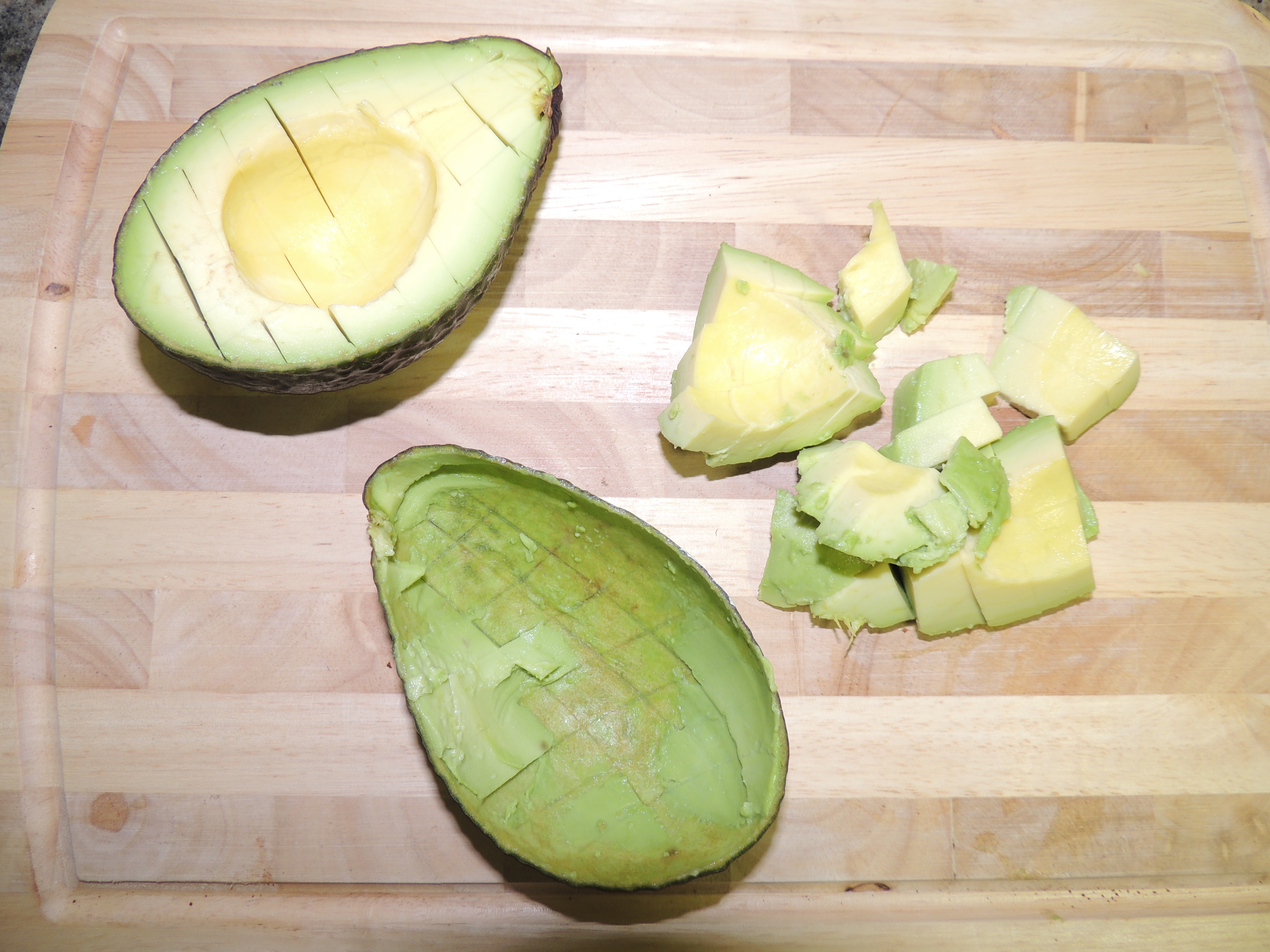 1.    Cut the avocados in half, remove the seeds and cut both vertical and horizontal lines (making a checkered pattern) in the avocado halves.