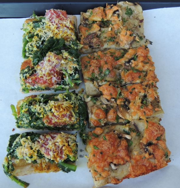 Next stop was a Pizza cafe that was noted in a so called food blog… The pizza looked quite fresh with quirky toppings!! The process was to chose the flavour you wanted and this was cut with scissors, weighed, priced and heated up for you!!